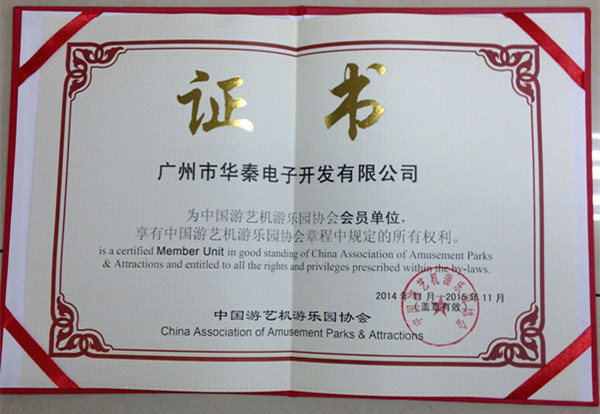 2014年廣州市華秦游樂設(shè)備有限公司(簡稱:華秦游樂)成為中國游樂機(jī)游樂園協(xié)會(huì)會(huì)員單位,享有中國游藝機(jī)游樂園協(xié)會(huì)章程中規(guī)定的所有權(quán)利