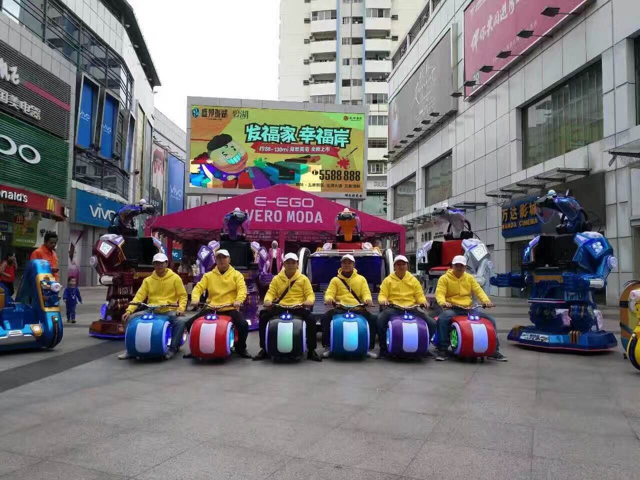 廣西南寧萬達(dá)廣場為進(jìn)一步豐富市民娛樂活動,于2016年12月跟我司合作,采購一批游樂設(shè)備,包括6臺鋼鐵俠成人版,六臺太子摩托,兩臺兒童版鋼鐵俠,兩臺樂逍遙等游樂設(shè)備,目前正在廣場火爆運營中。