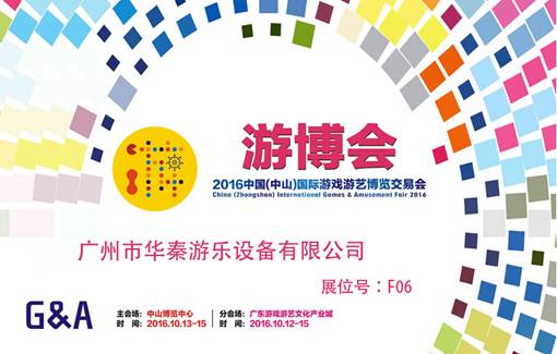 廣州市華秦游樂設(shè)備有限公司(下簡(jiǎn)稱:華秦游樂)將于本月13號(hào)到15號(hào)參加2016中國(guó)(中山)國(guó)際游戲游藝博覽交易會(huì),我們的展位號(hào)是F06,屆時(shí)歡迎各位新老朋友蒞臨參觀指導(dǎo)。